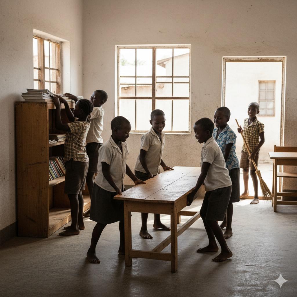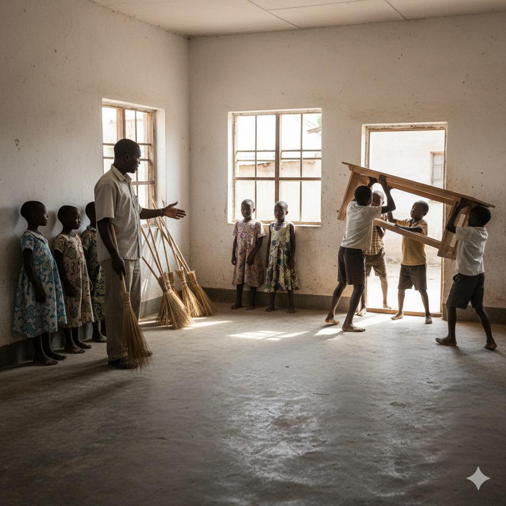 « Les filles, aidez-moi à balayer la salle. Les garçons, sortez les tables et les bancs. »